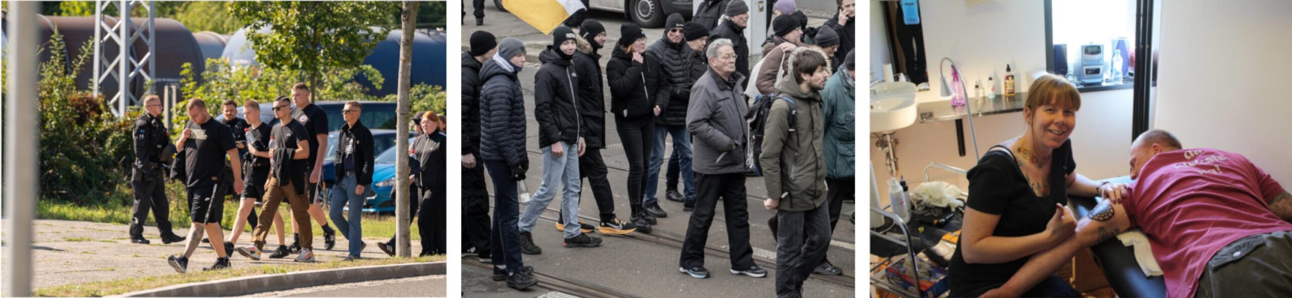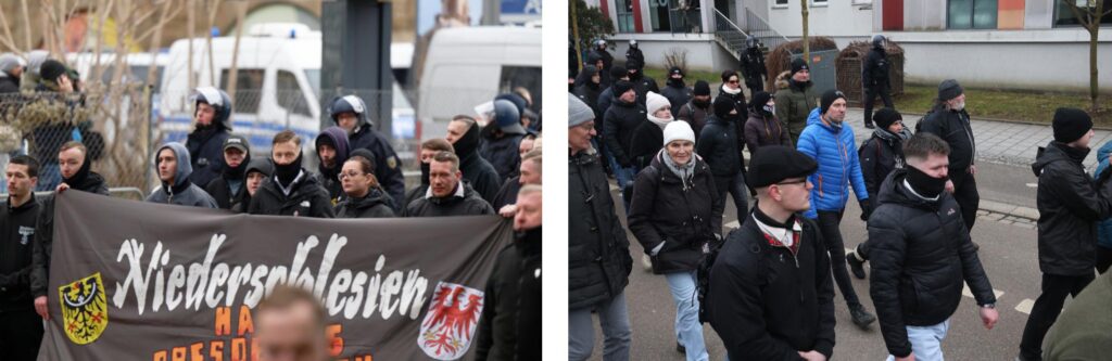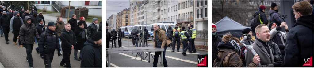 In Dresden fiel dieses Jahr außerdem eine Gruppe auf, die zumindest als JN-nah betrachtet werden kann und die es weiter zu beobachten gilt: Seit einigen Jahren tritt der Chemnitzer Neonazi Robert Käthner mit einer Gruppe von deutlich jüngeren, etwa 15- bis 25-jährigen Neonazis aus der Fußballszene auf. Sie bewegen sich immer wieder auf Aufmärschen, die von der JN dominiert werden und nahmen teilweise am JN-Interessiertentreffen 2024 teil. Weiter beteiligten sie sich an mehreren Anti-CSD-Protesten und störten etwa die antifaschistische Großdemonstration am 21.01.2024. Seit vergangenem Jahr waren auch die Geschwister Alma und Ole Willhardt immer wieder mit der Gruppe unterwegs. Mit zumindest einem weiteren Mitglied der Gruppe, „Roy“, nahmen sie am Trauermarsch in Dresden teil. Alma und Ole Willhardt sind Kinder der extrem rechten Tätowiererin Sylvia Willhardt, die seit etwa zehn Jahren mit dem langjährig aktiven Neonazi Thomas Ebert aus dem Blood-and-Honour-Umfeld liiert ist. Sie sind außerdem verwandt mit dem ehemaligen Kameradschafter und NPD-Vorsitzenden von Chemnitz, Sven Willhardt.